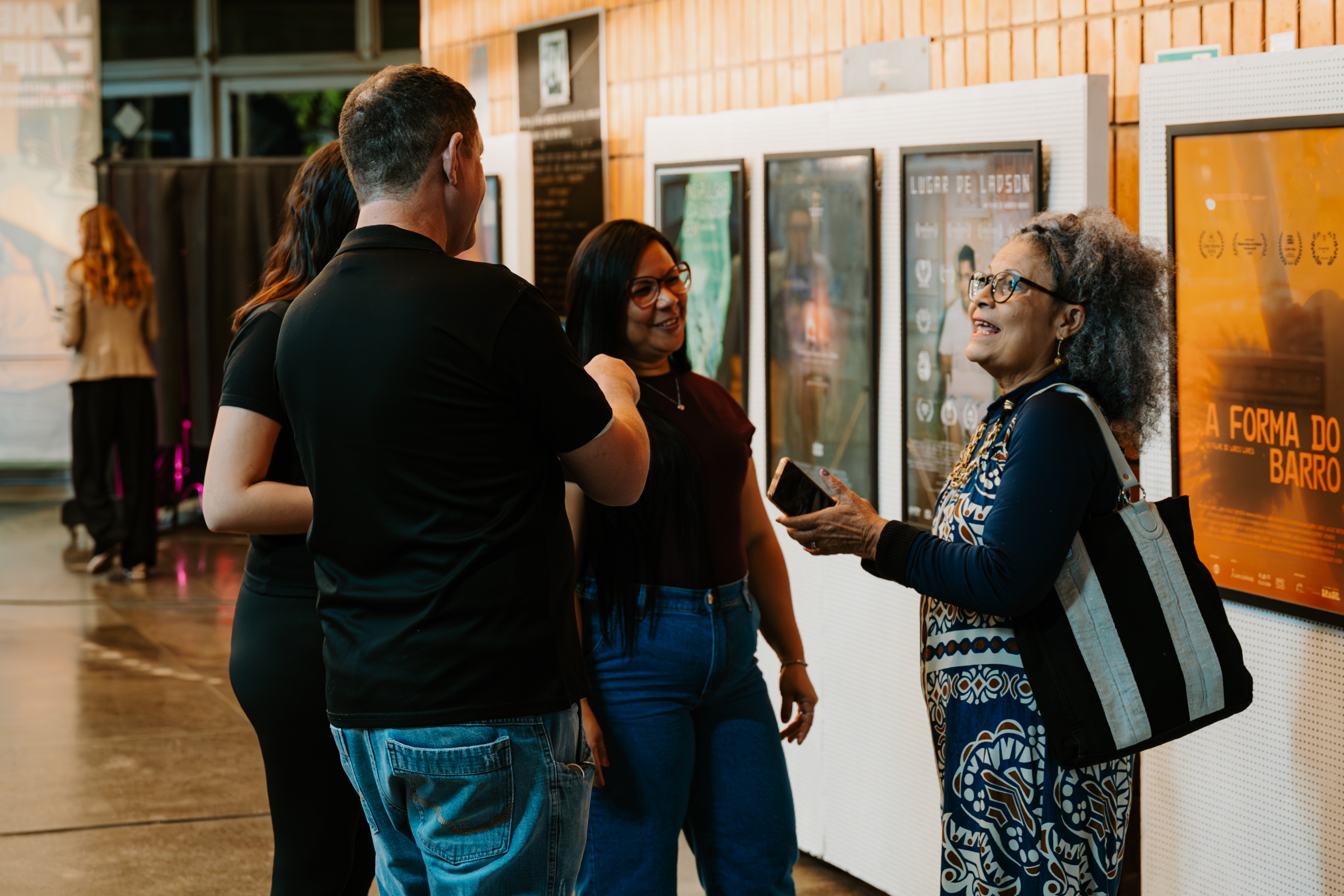 Durante o primeiro dia, a atriz Val Morari — com direito ao apresentador da sessão chamando-a erroneamente, em uma confusão engraçada, de Val Moreira — foi homenageada. Val Morari não virou atriz — foi sequestrada pelo cinema. Vinda do teatro, moldada por grupos formativos e pelo Coletivo Kino-Olho, Val fez do interior paulista sua trincheira criativa. Em “A Forma do Barro”, seu mais recente curta, Val retorna à tela após em colaboração com seu filhe. Mais do que uma homenagem, seu nome escrito nesta parede é o reconhecimento de uma artista que encarna, com coragem e sensibilidade, o poder do cinema de dentro para fora.